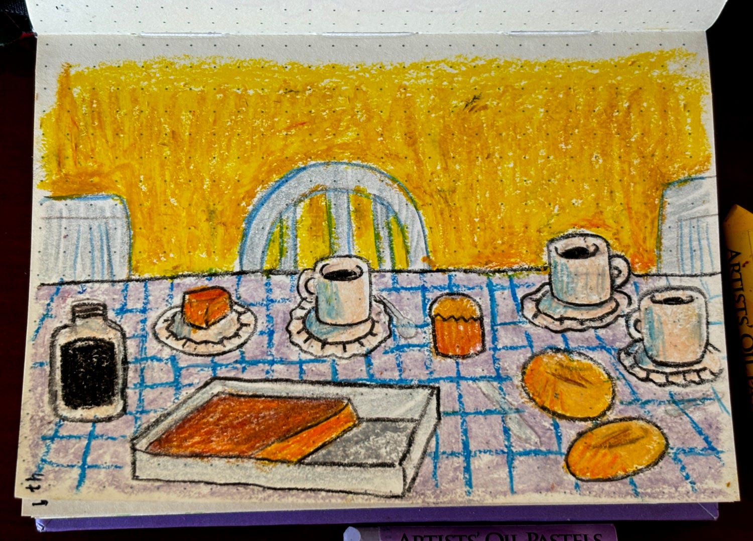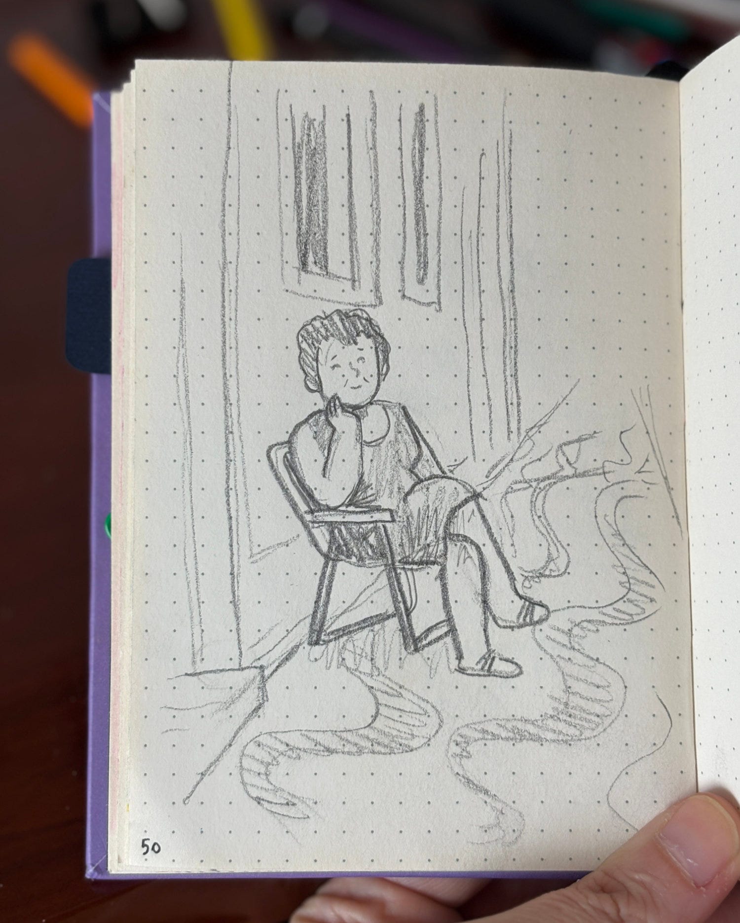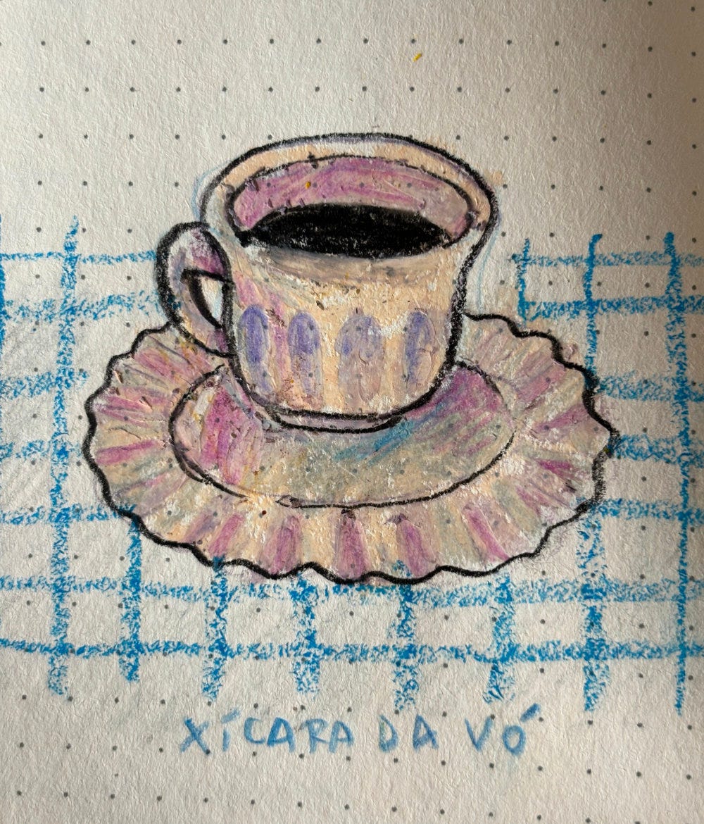 A salinha das visitas. Ela sempre sentava no canto esquerdo do sofá, pra controlar a loja, que ficava na sala ao lado. Tinha sempre banquinhos e cadeiras de praia a disposição quando tinha muita gente. Mas se fazia um dia bom, o lugar da conversa era na frente da casa, com as cadeiras de praia. E o chimarrão, sempre acompanhando. Fiz esse desenho em 2021, no meio da pandemia, quando a casa ficou sem visitas pela primeira vez.