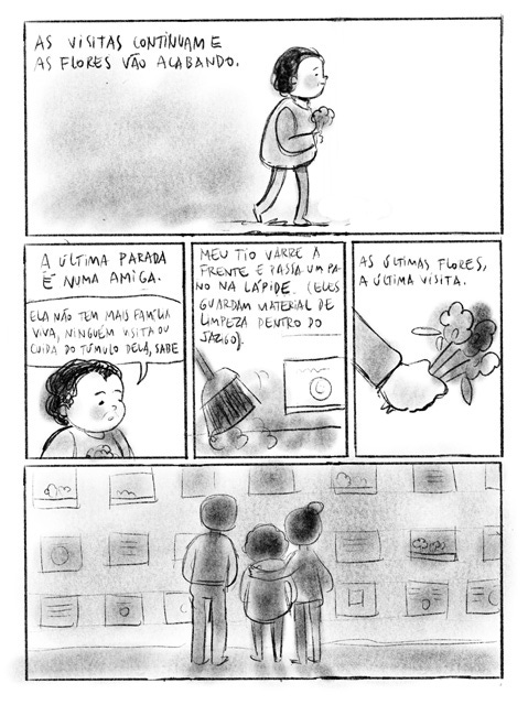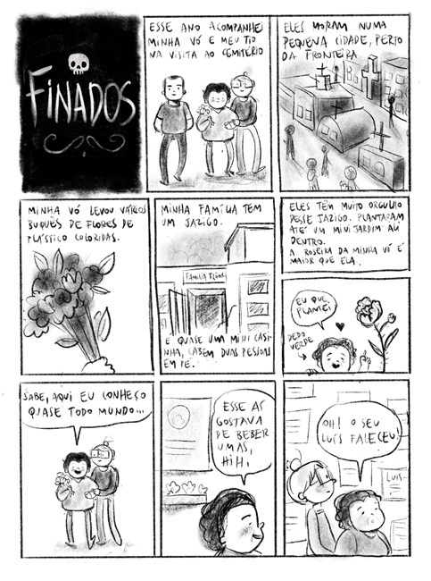 A cidade da minha vó tem muitos cães de rua. O cemitério é um pouco afastado da cidade, mas obviamente tem sua própria gang canina: os guardiões do cemitério, 3 cuscos pretos. Infelizmente nos últimos anos eu tenho frequentado esse cemitério e já conheço os 3. Eles não incomodam ninguém, não latem, não fazem nada: só ficam ali na volta da capelinha, geralmente dormindo. Quando chegamos para o velório eles estavam lá. Mas tinha uma cachorrinha nova: quando a gente chegou ela pulou na porta do carro, quase dando boas-vindas, um comportamento totalmente diferente dos guardiães, que ficam sempre quietos e afastados. A Fina (eu a chamei assim, porque ela era muito magrinha e comprida) nos acompanhou faceira do carro até a capela e até entrou com a gente. Ela se posicionou bem embaixo do caixão e ali ficou, dormindo a noite toda e nos fazendo companhia. Apesar de ser dezembro, fazia um pouco de frio naquela noite. Tem um tapete na capela, provavelmente por isso ela ficou ali. Mas ela também me trouxe uma certa leveza: era reconfortante olhar para o caixão e vê-la ali com a vó. Quando amanheceu ela se espreguiçou, deu uma olhada pra nós e foi embora. Não se juntou aos guardiões do cemitério, ela foi embora e não a vimos mais.
