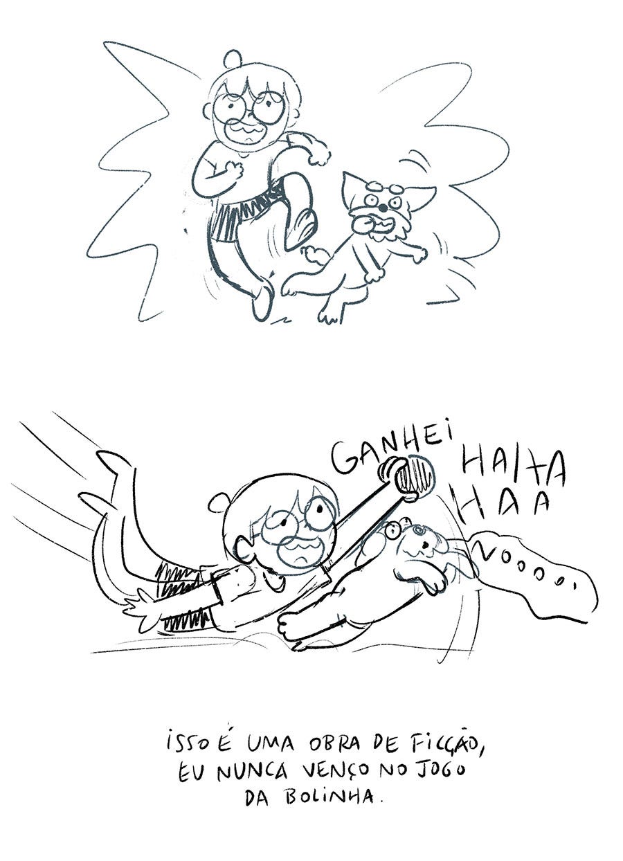 Criei uma versão paga dessa newsletter, só pra testar, e já tem 2 lindos assinantes! Obrigaaaaada. A ideia é postar mensalmente algo da HQ que estou trabalhando, mas ainda não consegui decidir exatamente como seriam esses textos. Se vão ser desenhos, se vão ser meus dilemas enquanto escrevo e desenho a HQ (sim, comecei a finalizar sem ter o roteiro terminado, de novo, parabéns samanta!), ou trechos já prontos, eu realmente não sei ainda, por isso não divulguei. A ideia é me incentivar a seguir trabalhando nela e não renegar pra um segundo ou terceiro plano, como tem acontecido. Mas é o eterno dilema do artista freelancer: os trabalhos que pagam as contas acabam tomando prioridade.
